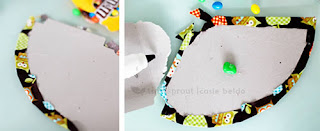Após riscar o molde no papelão e cortar, pegue um pedaço de tecido e corte no formato do molde. Cole o tecido no molde.